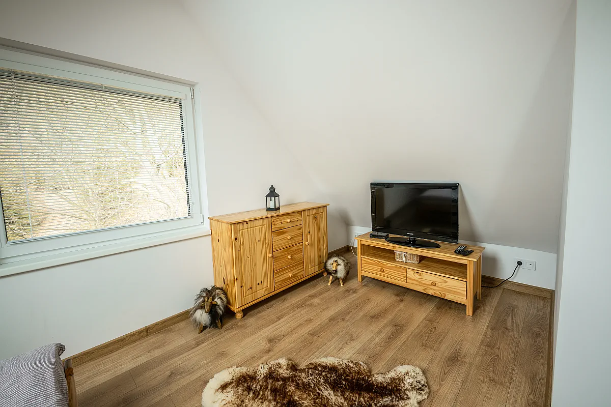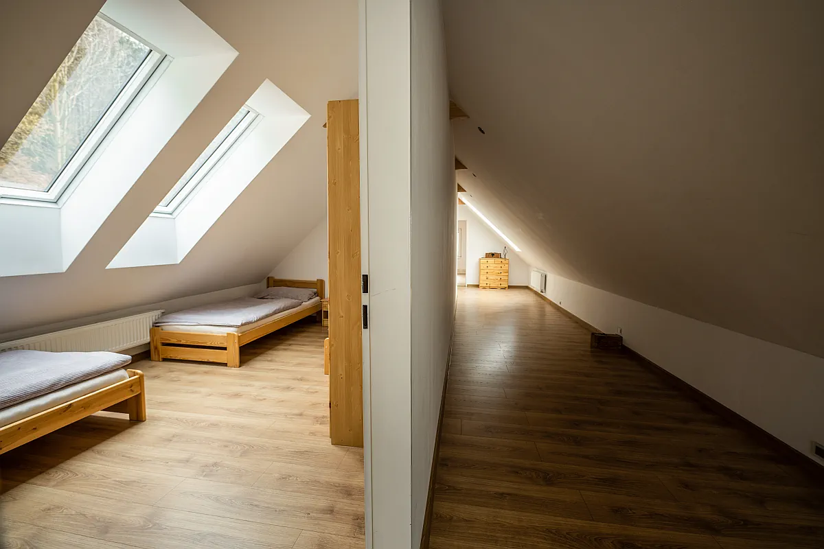 Po krásně osvětleném dřevěném schodišti se dostáváme do vrchního patra, kde na Vás čekají 4 samostatné pokoje. Dva boční pokoje s manželskými postelemi a TV. Uprostřed 2 ložnice se 3 samostatnými postelemi. Z každého pokoje je nádherný výhled ať už na horu Smrk, krásný les nebo v noci můžete pozorovat hvězdy. V každém z těchto pokojů se nachází velké střešní okno, přes které lze pozorovat překrásnou noční oblohu beskydských hor.